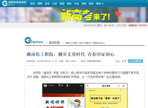 本网讯(通讯员 李菡 刘秋云)线上教学只能老师唱主角?特殊时期学习只能囿于象牙塔内?近期,湖南化工职院思政课部打开思路,让“行走的思政课”在云端延续。